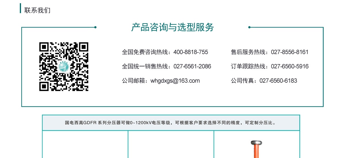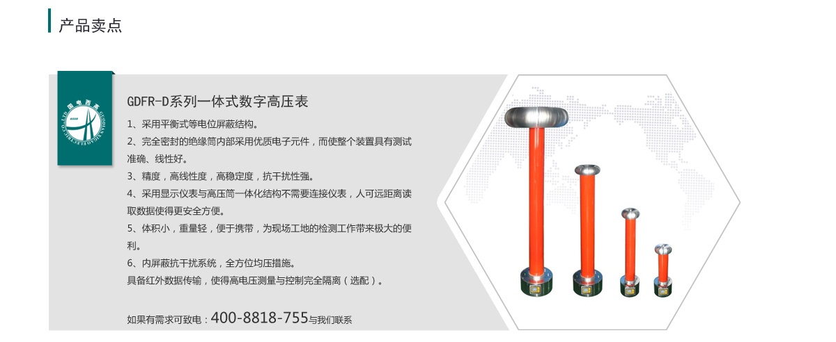 GDFR-D型系列數字高壓表(分壓器)采用阻容式分壓器和高阻數字表一體化設計,實現高壓測量與顯示,客戶可根據所測量電壓精度要求,來選擇不同的準確度。該系列最高準確度分別為:AC:0.5% DC:0.5%,若需更高準確度,可選擇我公司的高精度、高穩定度的交流校驗標準和直流校驗標準;采用電位屏蔽式高壓測量裝置,是我公司最新研發的產品,與其他公司同類產品相比,國電西高采用美國進口的填充介質,內部采用多種專利屏蔽技術,使該系列產品有更長的使用壽命和更高的穩定性,在該領域擁有絕大部分的市場占用量和市場美譽度。