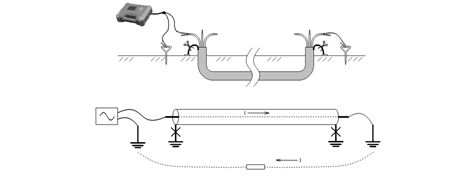 電流自發(fā)射機(jī)流經(jīng)芯線,在電纜對端進(jìn)入大地,流回近端返回發(fā)射機(jī)。這種接法在地面探測時(shí)接收機(jī)可以感應(yīng)到很強(qiáng)的信號國電西高信號特性比較明確,可以充分利用儀器的防誤跟蹤功能;信號在絕緣良好的芯線上流過,不會流到鄰近管線上,尤其不會流到交叉的金屬管道上,最適于在復(fù)雜環(huán)境下進(jìn)行路徑查找。另外由于電纜接地,流經(jīng)電纜的信號電壓很低,不容易對鄰線產(chǎn)生電容耦合,減少干擾。