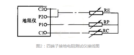 將標(biāo)準(zhǔn)器、等效輔助接地電阻按圖1(三端子接地電阻測試儀)或圖2(四端子接地電阻測試儀)所示的方式與接地電阻測試儀連接。