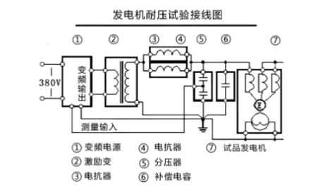 串聯(lián)諧振試驗(yàn)方法并不難,它由變頻電源輸入電壓,再調(diào)節(jié)頻率,調(diào)節(jié)輸出容量,最后將電壓輸入到變壓器的端頭,有關(guān)串聯(lián)諧振的具體接線和測試方法我們已經(jīng)講過多次,下面看看接線的原理圖: