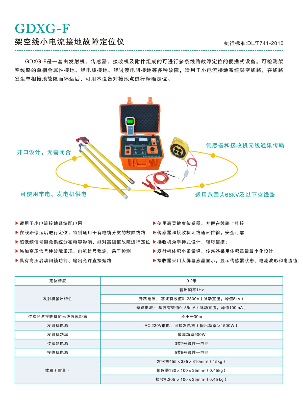 GDXG-F是一套便攜設備,可進行多條線路的故障定位。整套設備由發射機、傳感器、接收機及附件組成。在故障線路停運后,由發射機向線路施加超低頻高壓信號使故障重現,在線路沿途用絕緣桿將傳感器掛在線路上檢測信號,并通過無線方式向地面上的接收機傳輸數據,接收機顯示測量結果。在故障點前,電流持續存在,故障點后,電流消失。可先進行粗略分段,再精確定點,從而快速確定故障位置。