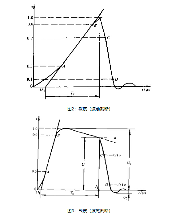 如圖2和圖3所示。表1列出了雷電沖擊電壓標(biāo)準(zhǔn)波形參數(shù)和容許偏差(CB/T169271-1997)。