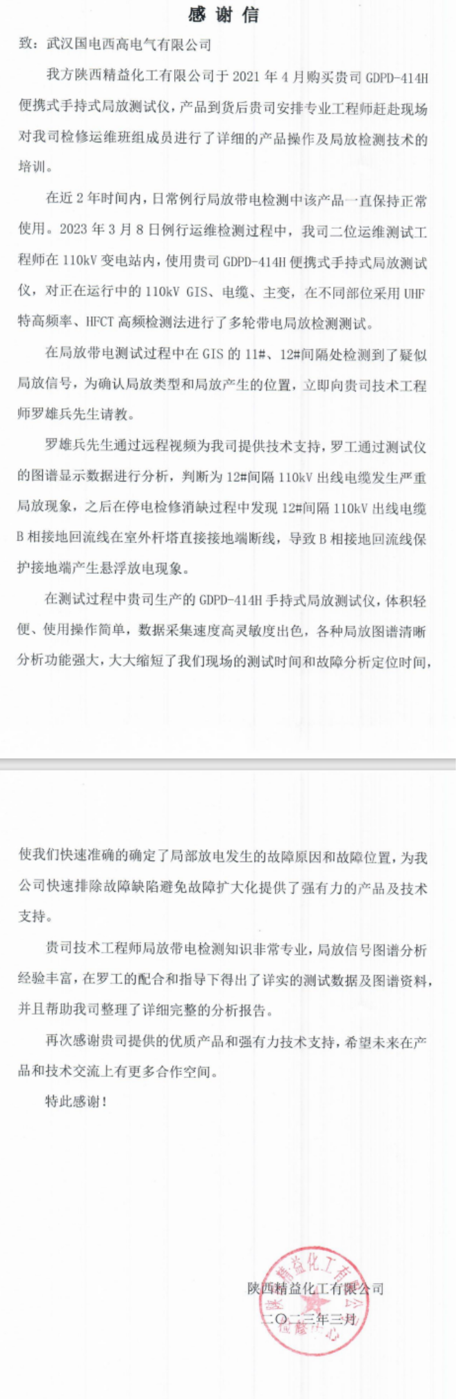 近期,國電西高收到一封來自陜西精益化工有限公司發來的感謝信。信中對雙方的合作進行了高度評價,對我司局放巡檢產品及技術工程師羅雄兵表示了肯定與贊揚。