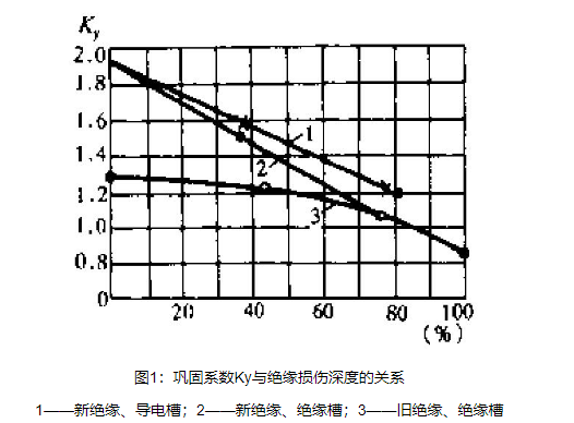 由圖1可見,新絕緣的Ky值隨損傷深度的增加而成比例地減小,如曲線2所示。對于舊絕緣(運行相當長時間的),在同一損傷深度下,其Ky值均比新絕緣要小,且在損傷深度為0~40%的范圍內時,Ky值基本不變;損傷深度為40%~100%范圍內時,Ky值即非線性下降并可降至1及1以下。曲線1也是新絕緣,只是試驗的條件不同,使曲線的斜率變小,從而在同一損傷深度下,Ky值偏高。圖1曲線表明: