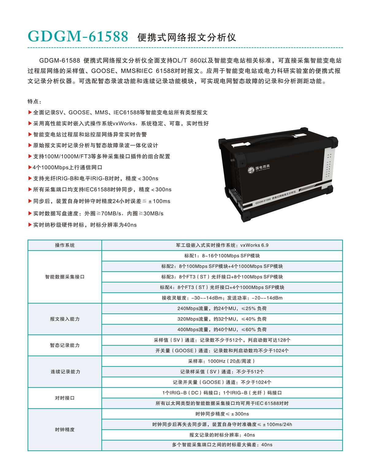 GDGM-61588可直接采集智能變電站過程層網(wǎng)絡(luò)的采樣值、GOOSE、MMS和IEC 61588對時報(bào)文。可選配暫態(tài)錄波功能和連續(xù)記錄功能模塊,當(dāng)選配暫態(tài)錄波功能后,即可實(shí)現(xiàn)電網(wǎng)暫態(tài)故障的記錄和分析測距功能。