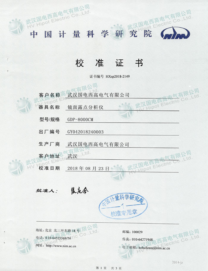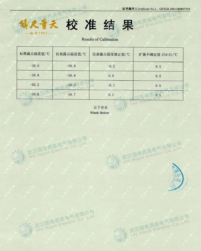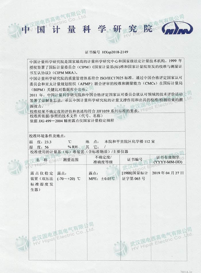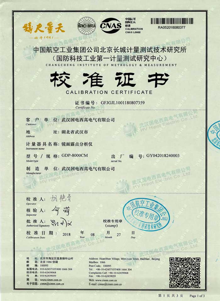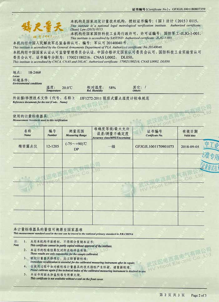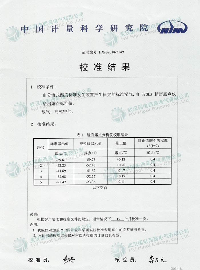 其中,GDP-8000CM型便攜式冷鏡法SF6氣體露點儀通過國家一級計量院“中國計量科學研究院”“中國航空304所”檢測,精度優于±0.2℃。