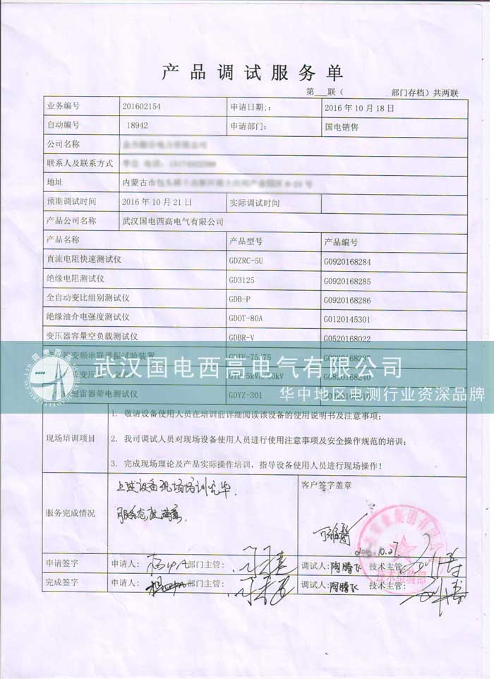 在與客戶取得聯(lián)系后,經(jīng)雙方溝通,較快的定制了此次調(diào)試的具體安排和計劃,計劃所需調(diào)試的一批產(chǎn)品包括:GDZRC-5U直流電阻快速測試儀、GD3125絕緣電阻測試儀、GDB-P全自動變比組別測試儀、以及絕緣油介強(qiáng)度測試儀,變壓器容量空負(fù)載等一系列產(chǎn)品。整個調(diào)試過程有三天,調(diào)試完成的十分順利。
